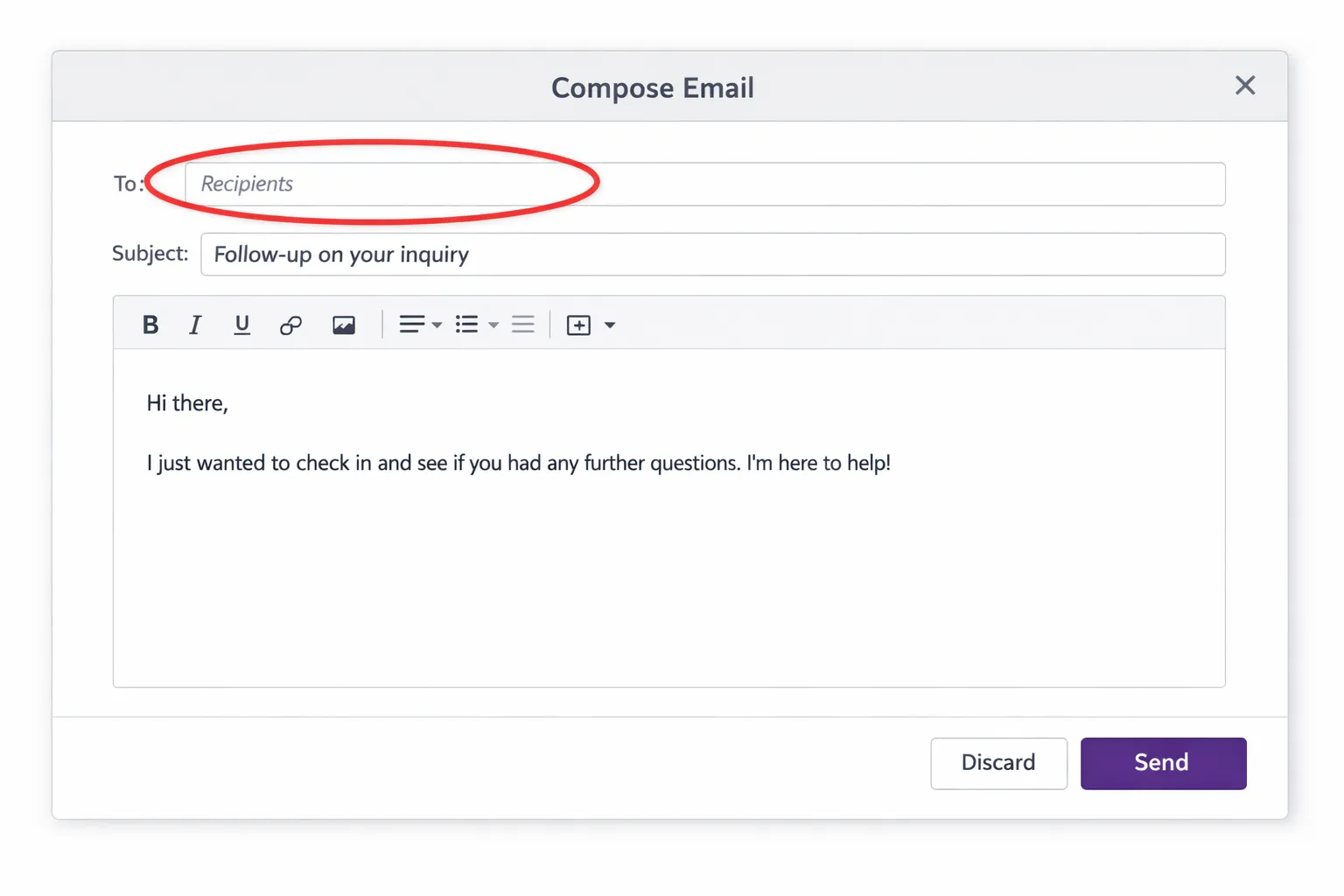 Standard Odoo CRM: The recipient field is empty – you have to manually search for the contact and add them as a follower.